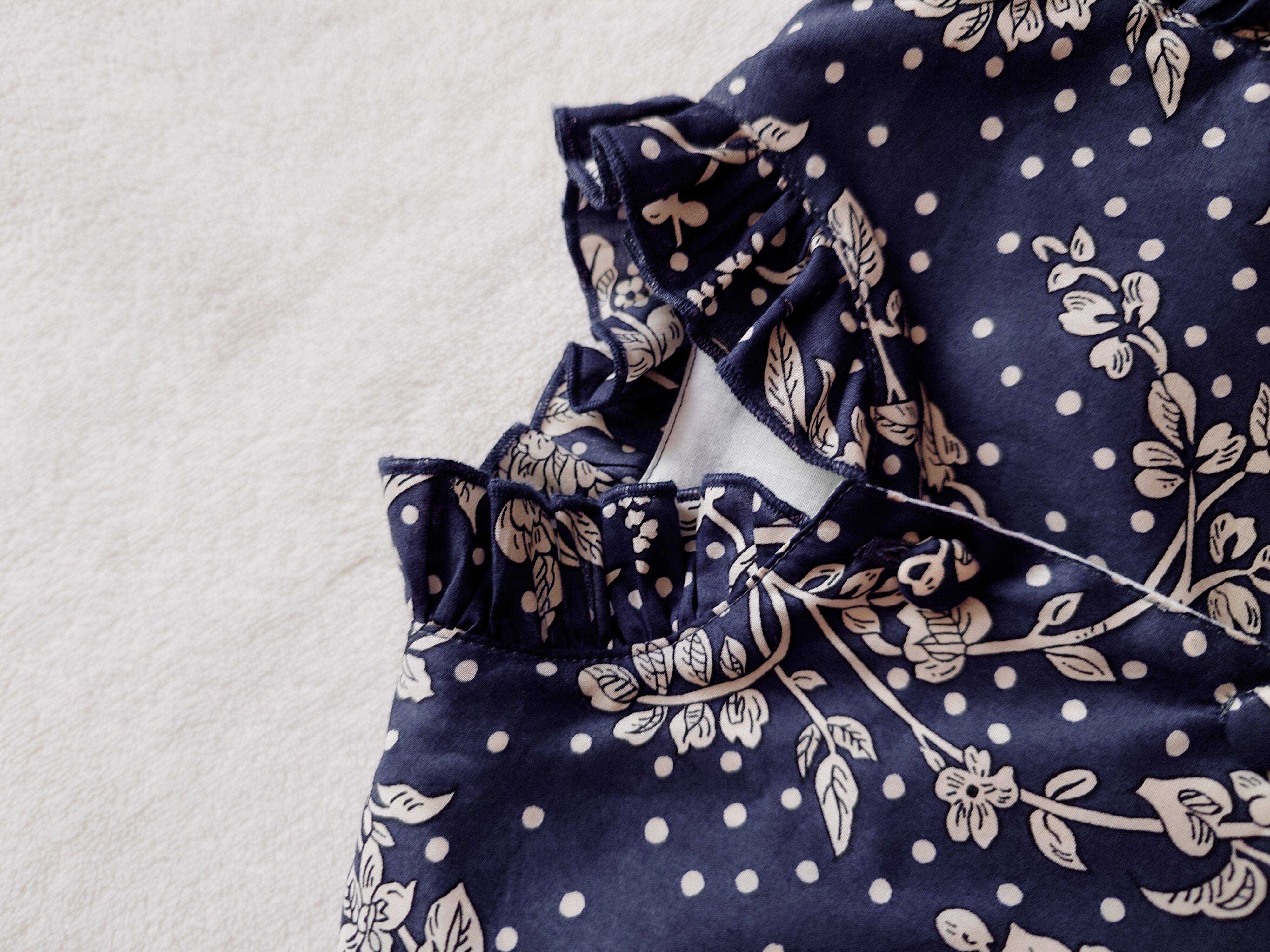 襟には細やかなギャザーを寄せ、ふんわりとしたラインに仕上げました。